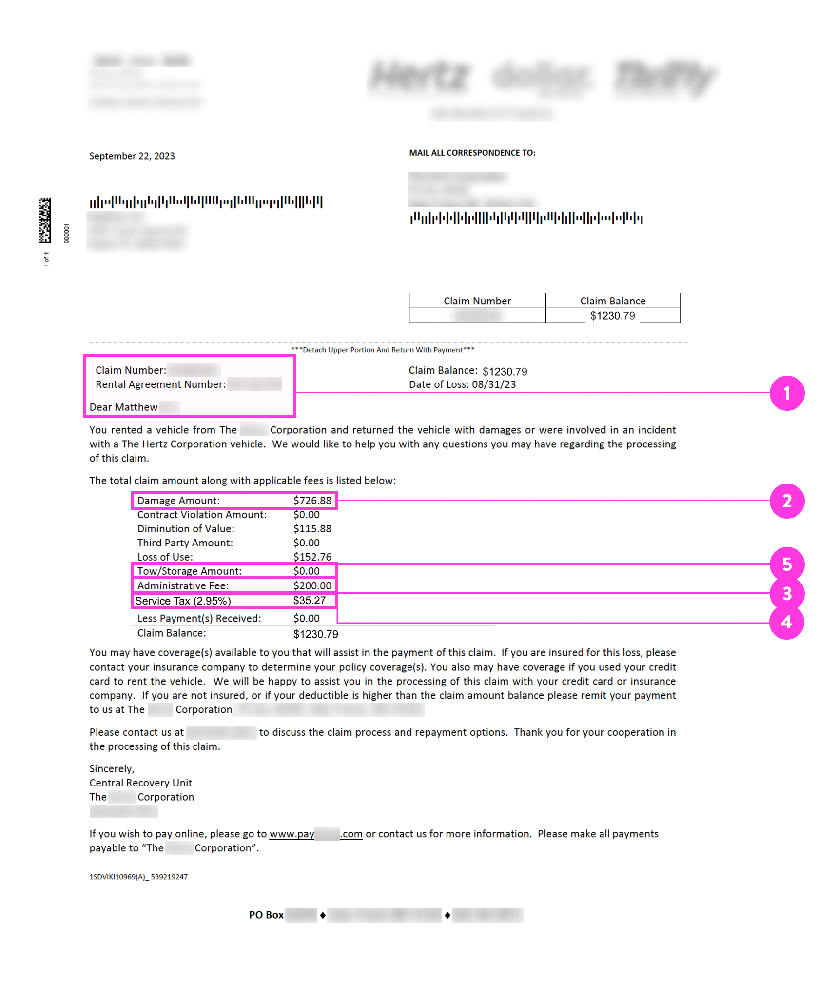 After your trip has ended, your rental company will provide you with documentation showing the final charges for the damage to the vehicle. This can be a demand letter, demand invoice or final invoice and will typically include a breakdown of the damage costs, administration fees, loss of use charges or towing and storage fees.